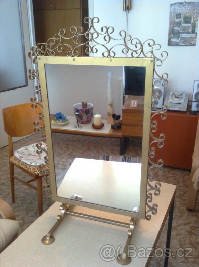 Kadeřnické zrcadlo 81x50 cm v uměleckém zlaceném rámu na stojanu ze kterého lze sundat a pověsit na stěnu.Lépe zavolat.